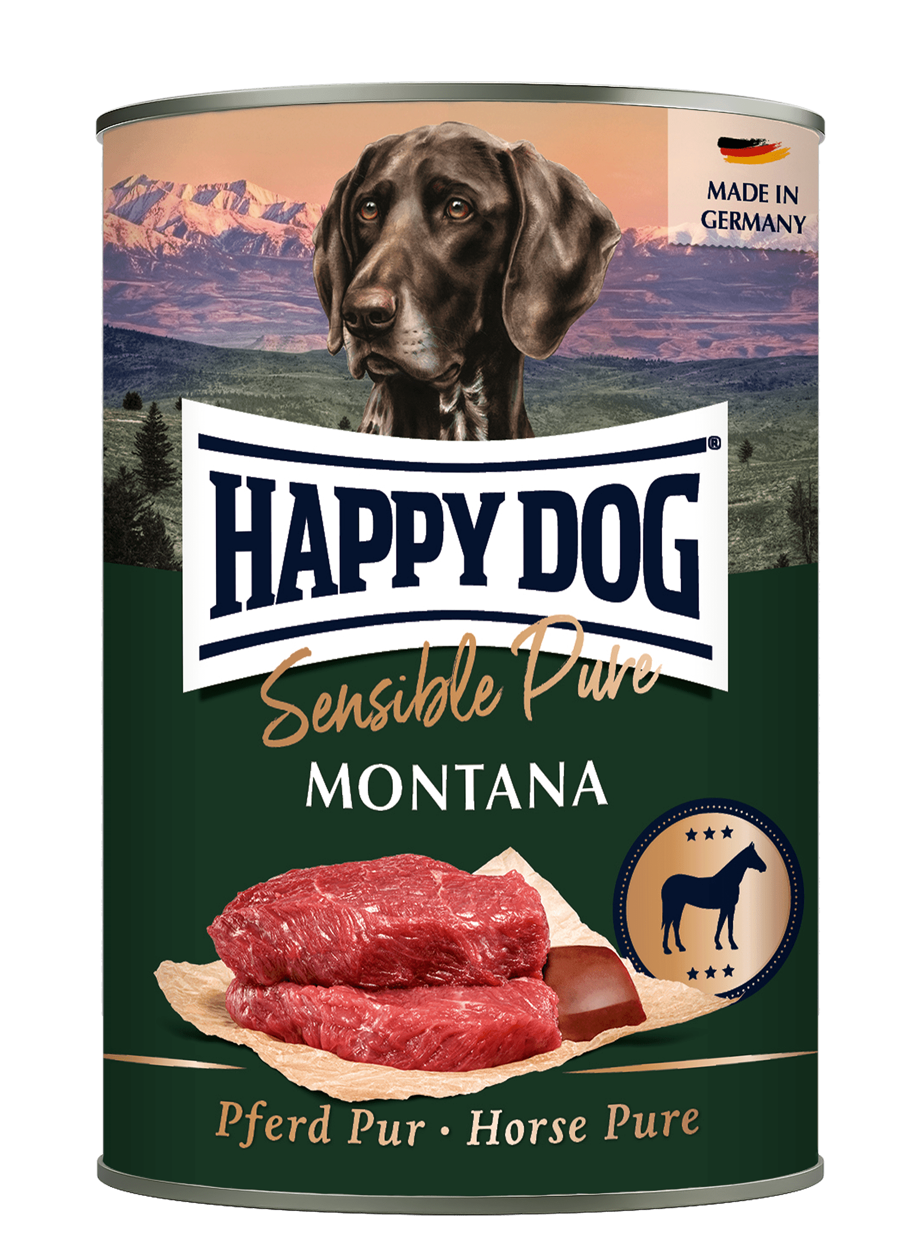 Med Happy Dog Sensible Pure Montana høykvalitets boksemat er laget av 100 % verdifullt kjøtt og innmat, som hjerte, lunger og lever, og inneholder essensielle vitaminer og mineraler. Kjøtt og innmat kommer utelukkende fra hest*. Premium våtfôret er naturlig laget uten soya eller andre plantebaserte tilsetningsstoffer. Sensible Pure Montana er ideell for voksne hunder av alle raser og for mating av sensitive hunder med matintoleranse. Den rene boksematen er perfekt for fôring alene, så vel som for hjemmelagde godbiter og kan ideelt kombineres med Happy Dog Flocken Mixer. Flocken Mixer er perfekt for et sunt kosthold, viktige kostfibre fra grønnsaker støtter fordøyelsen og karbohydrater fungerer som energileverandører. Ønsker du mer variasjon i menyen til din firbeinte venn, som ellers mates med tørrfôr? Da kan du enkelt bytte ut en del av tørrfôret med en porsjon våtfôr og dermed sikre nye nytelsesøyeblikk for din kjære. Happy Dog Sensible Pure Montana kan ideelt sett kombineres med tørrfôret Happy Dog Sensible Montana (hest og potet).