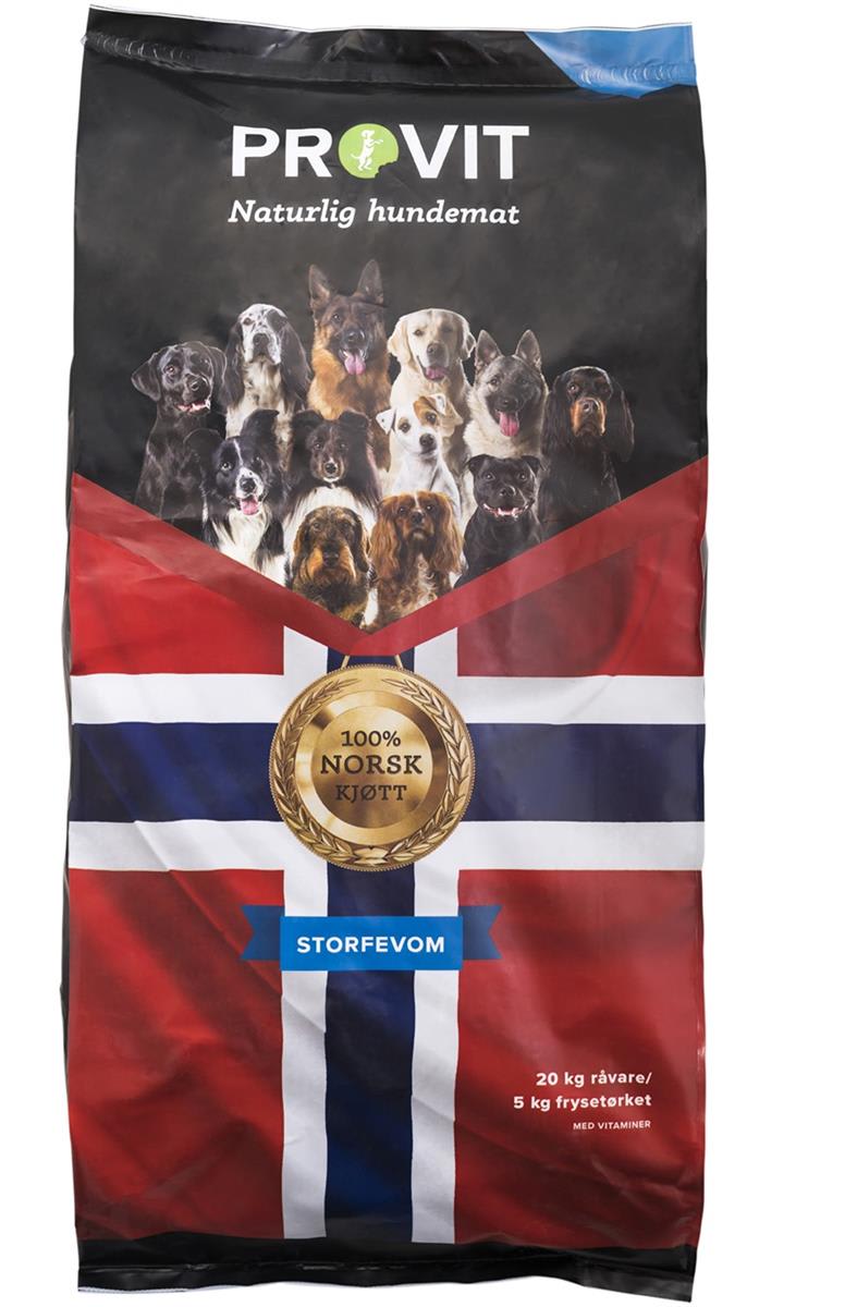 Provit frysetørket storfevom er et hundefôr av høyeste kvalitet. Fôret er 100% naturlig og laget av rå storfevom fra norsk storfe. Frysetørking bevarer råvarens kvalitet, smak, næringsinnhold, mineraler og vitaminer. Med vitamintilskuddet er dette et fullverdig fôr.
